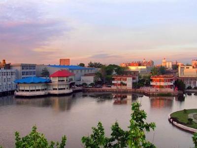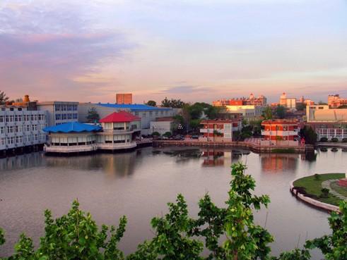 天津工业大学天津工业大学新校区用地总面积约2800亩,东西宽1100米,南北长1680米。校区“水由人治,宛如天开”,北山南湖,一条优美的弧形湖岸线把校园划分为东西两块,湖水从校园东北角流入,分布弥漫于校园中心,又从东南角流出。湖水居中,西侧是自然湖岸,曲曲折折,为文理艺术类学院所在;东侧是人工湖岸,整整齐齐,为工程类学院所在。湖岸形成的对比,理工学院的差异,交互辉映,相得益彰。水面、绿地或大或小,有机的结合,自如的收放,共同构成景观空间的或开敞或幽深,有机地穿插,自如的扬抑。漫步于校园,或表现诗的情思、或展示画的意境、收自然美境与其间。