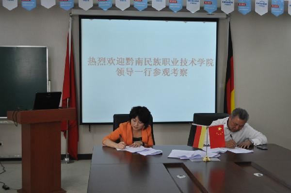 双方签订合约2013年9月28日,黔南民族职业技术学院院长胡朝映代表学院在北京经济管理干部学院二楼会议室与中德诺浩(北京)教育投资有限公司总经理许婕女士就“中德诺浩高技能型技能人才培养项目”和“中德诺浩紧缺技能型人才培养项目”进行了充分的磋商并签订了合作办学备忘录。双方确定:学院自2014年起为该公司“订单”培养中职人才60人、高职人才60人,以实际招生为准;初步确定春季合作中职专业为汽车运用与维修、汽车服务与营销,高职专业为汽车检测与维修、汽车服务与营销;自签字之日起,双方按照《备忘录》要求,完成合作协议签订、项目报批、人员培训、实训室改造、招生方案的策略制定等后续工作。[3]