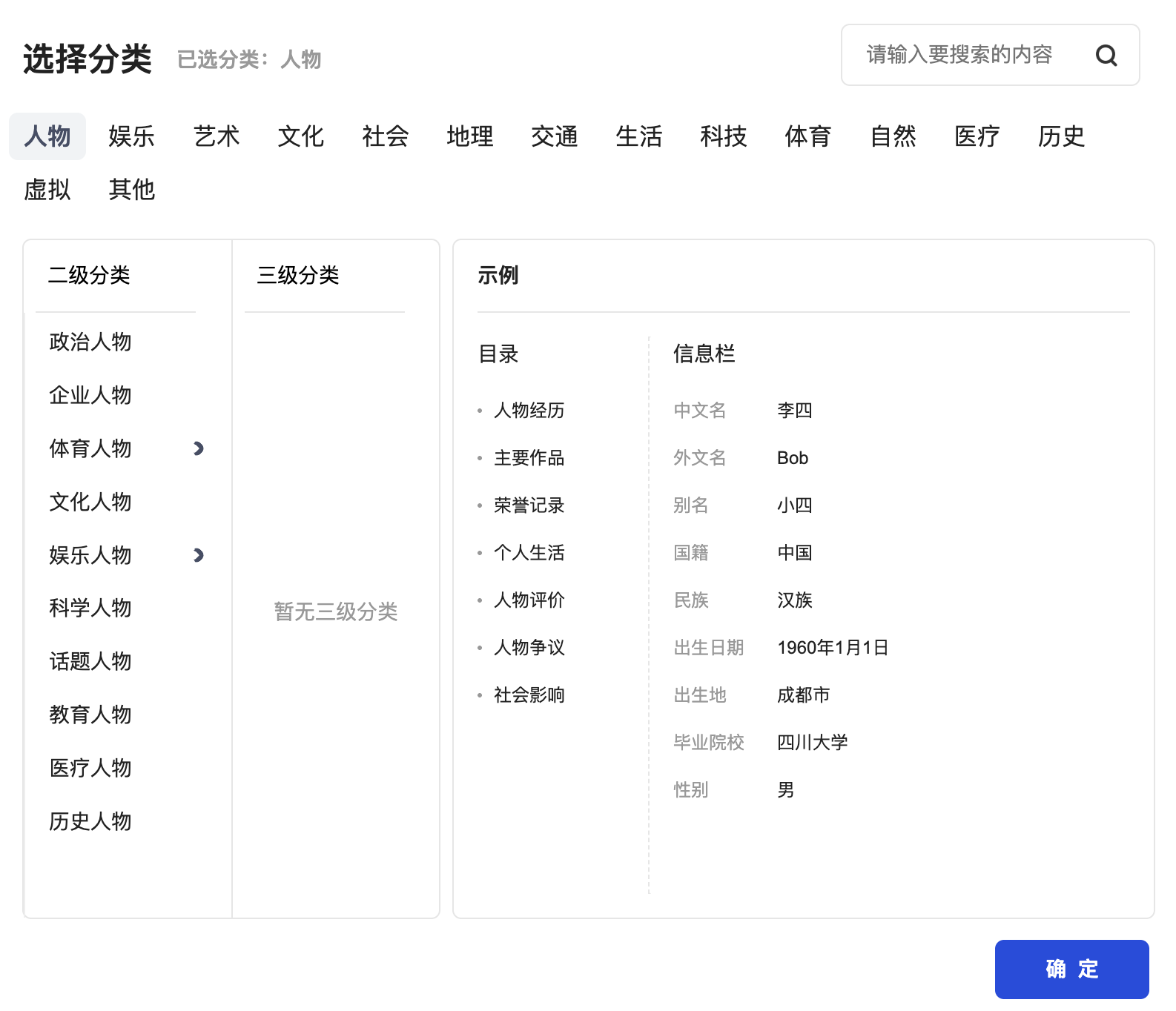 | 建议人物、影视等分类内容使用编辑器相应模块进行内容添加,或在正文中通过添加表格编辑杂乱数据,保证版式美观,内容清晰。 | ![]() |