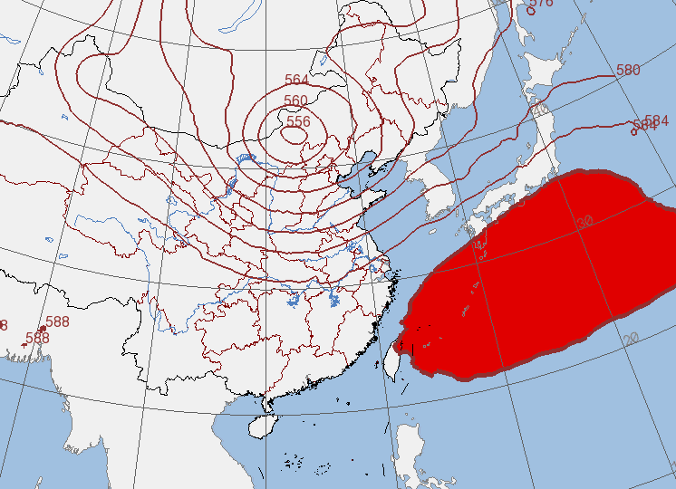在天气分析预报中,副热带反气旋范围多以等压面图上的特定等高线来表示,在500hPa等压面图上用588位势什米线的范围来确定,700hPa等压面图上一般以312位势什米线、850hPa等压面图上以152位势什米线、地面天气图上以1010.0 hPa等压线所围范围来确定。
