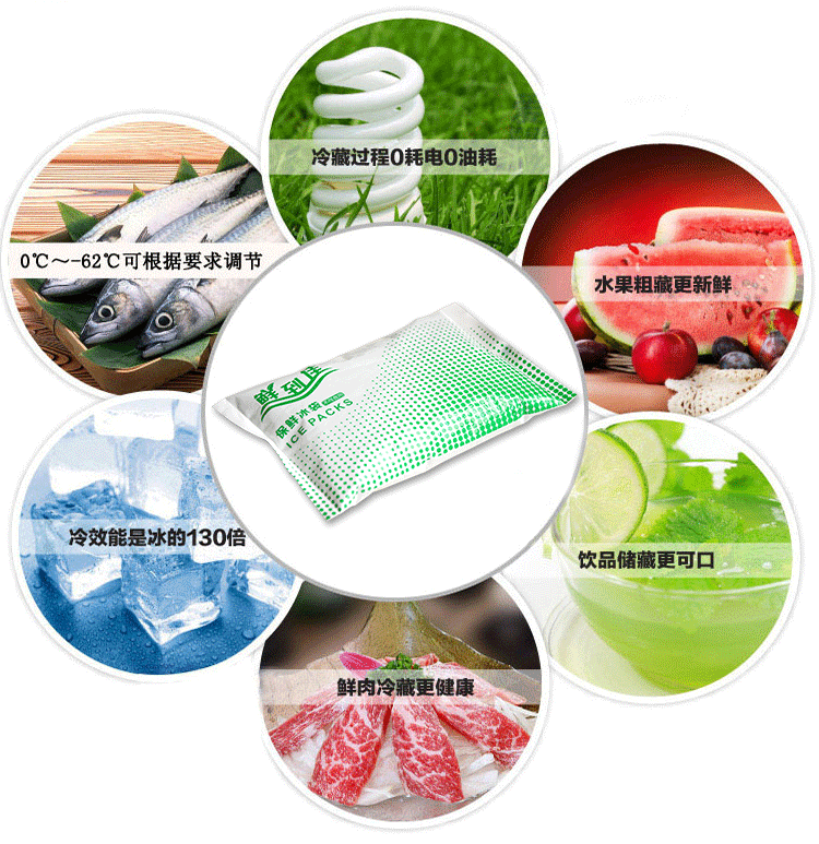 5、日常生活蓄冷节电,在冰箱断电时维持低温、食品保鲜、冰镇饮料、旅游携带。